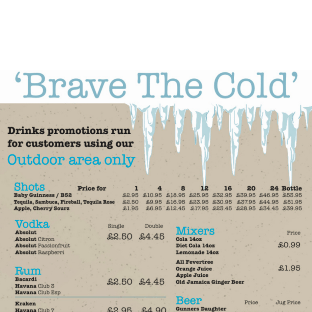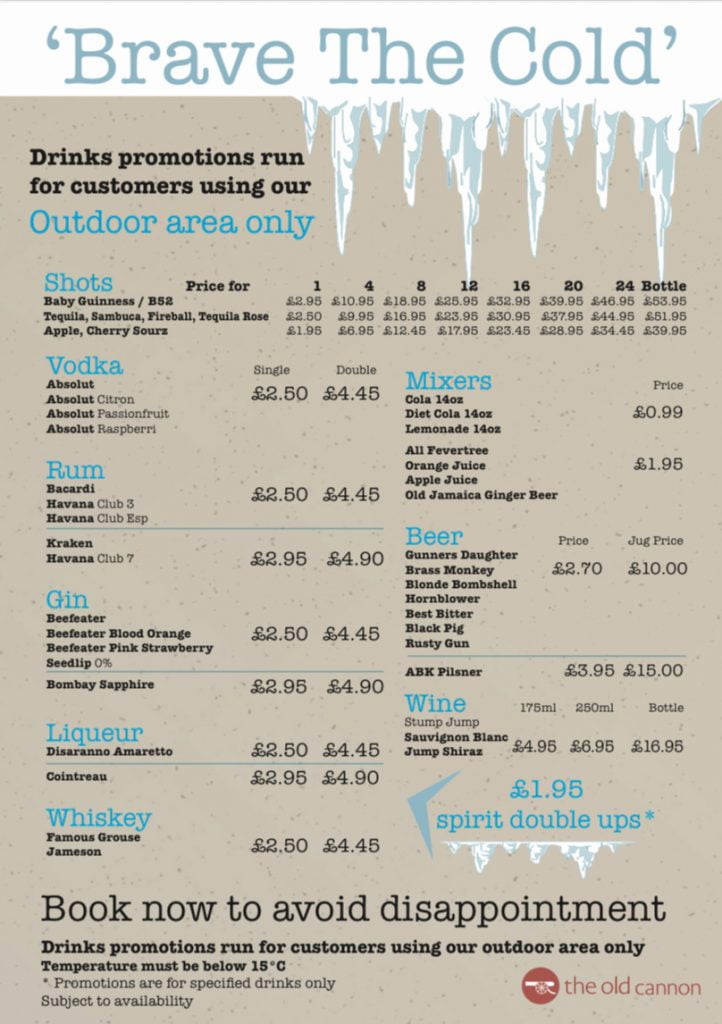 Brave the cold with The Old Cannon this Valentine’s Day where Customers in the outdoor area only will receive discounted drinks.